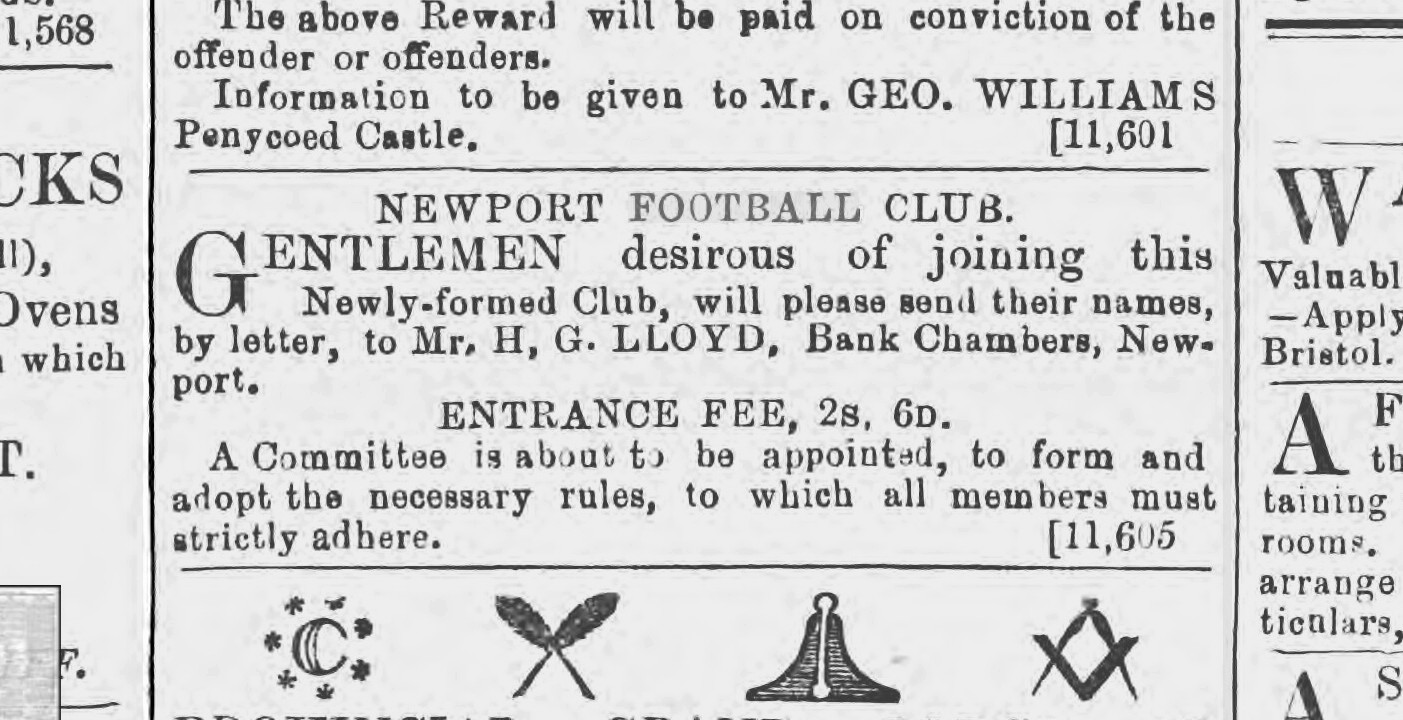 The official formation of Newport Rugby Club has long been considered as being in 1874 but some form of hybrid rugby or football in the town pre-dates this, with 15 players each side and including punt kicks and touch downs. An advertisement was placed in the Monmouthshire Merlin of 9th November 1867 entitled 'NEWPORT FOOTBALL CLUB' and announcing 'Gentlemen desirous of joining this newly formed club, will please send their names, by letter, to Mr. H. G. Lloyd, Bank Chambers, Newport. Entrance Fee, 2s. 6d. A committee is about to be appointed, to form and adopt the necessary rules, to which all members must strictly adhere.' The Merlin observing 'Football will be a very pleasant addition to the sports which are generally enjoyed during the winter month. The first match is to take place on the Marshes, on Thursday next, the 14th. inst.. at 2.30p.m., between 15 of the Abergavenny Football Club and 15 gentlemen of Newport. It is intended to play scratch matches every Thursday after noon on the Marshes.'