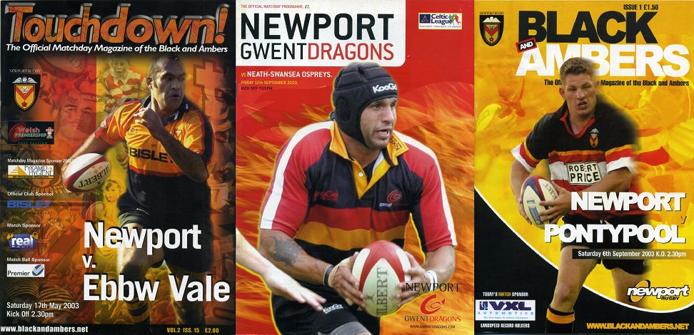 All changed in Welsh rugby with the introduction of five, full-time, professional 'regional' sides in 2003 (later reduced to four with the demise of Bridgend based Celtic Warriors). Many of Newport's players moved seamlessly into the new senior side, fielded by Newport RFC Ltd. through its subsidiary Dragons Rugby Ltd., and soon to be called Newport Gwent Dragons. Fully controlled and 50% owned by Newport RFC (with the other 50% held by the Welsh Rugby Union) the unbroken continuation of top-class professional rugby at Rodney Parade necessitated significant loan-funded investment, with new terracing, all seated grandstand, catering and hospitality facilities at Rodney Parade. As with the other clubs running 'regional' sides, Newport continued to maintain an additional but separate presence at semi-professional development level in the new Welsh Premier league. In its first season of 2003-04 Newport RFC duly set the standard by winning the new Premiership in style losing only 2 matches. But dark clouds were gathering!