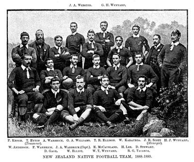 MAORIS- D. Gage; H. Wynyard, W. Wynyard, E. MCausland; F. Warbrick, W. Elliott, P. Keogh; T. Ellison, W. Karauria, G. Wynyard, A. Webster, H. Lee, G. Williams, D. Stewart, A. Warbrick.