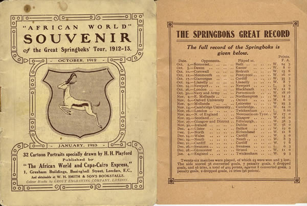 Rugby had been started in South Africa in 1861, they first welcomed the British Isles in 1891 with the tourists playing and winning 20 games! Rugby Union prospered - South Africa improved - in 1896 the British Isles were defeated in one of the test matches - in the 1903 tour South Africa won the series 1 nil with 2 drawn games. They travelled to Europe in 1906 - the first time the nickname 'Springboks' was used - lost only two games, to Scotland and, I have to say it, the team at the other end of Cardiff Road (17 v 0). In October's Rodney Parade game Newport were not outclassed, but overwhelmed by the size and physicality of the South Africans and lost 0 v 8 in front of 19,000 spectators.