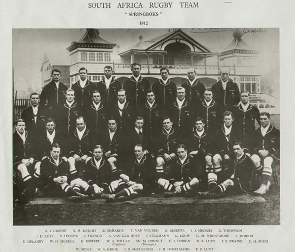 "SOUTH AFRICANS.- J. J. Meintjes (Griqualand West), back; J. Stegmann, R. Luyt, and G. M. Wrentmore (Western Province), and A. Van der Hoff (Transvaal), three-quarter-backs; J. Immelman and F. Luyt (Western Province), half-backs; W. A. Millar (captain) and G. Thompson (Western Province), D. Morkel and A. S. Knight (Transvaal), J. S. Braine, E. Delaney, T. Van Vuuren, and J. D. Luyt (Eastern Province), forwards."