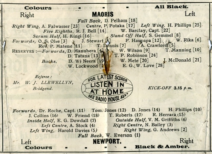 The W.R.U. was making an effort to minimise the destructive play by wing-forwards. By changing the off-side Law at a scrummage, the players on the non-heeling team could not advance beyond the front row until the ball was out. The Maoris were not happy about this change but after a special meeting the W.R.U. decided the visitors would have to conform. In actual fact the Maori captain, Wattie Barclay admitted after the match, "I think it's a good rule. It certainly makes the game quicker".