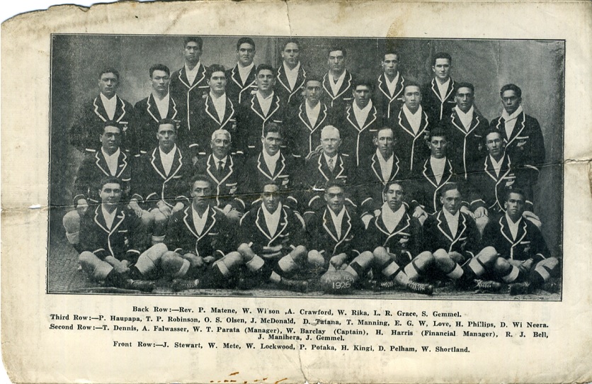 "MAORIS.- D. Pelham, back; A. Falwasser, P. Potaka, and H. Phillips, three-quarter-backs; R. J. Bell, and W. Barclay, five-eighths; S. Gemmell, rover; H. Kingi, half-back; O. S. Olsen, J. Stewart, P. Haupapa, W. Rika, the Rev. P. Matene, T. Dennis, and A. Crawford, forwards."