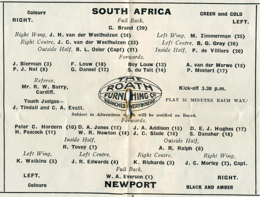 The third Springbok team to play Newport were a mighty and formidable collection of players. They came to Wales determined to put the 1912 defeat to the 'Black and Ambers' behind them and did so comprehensively. A huge forward pack, unusual for its time, dominated the game ensuring that the South Africans won by four tries and a penalty to a solitary try.