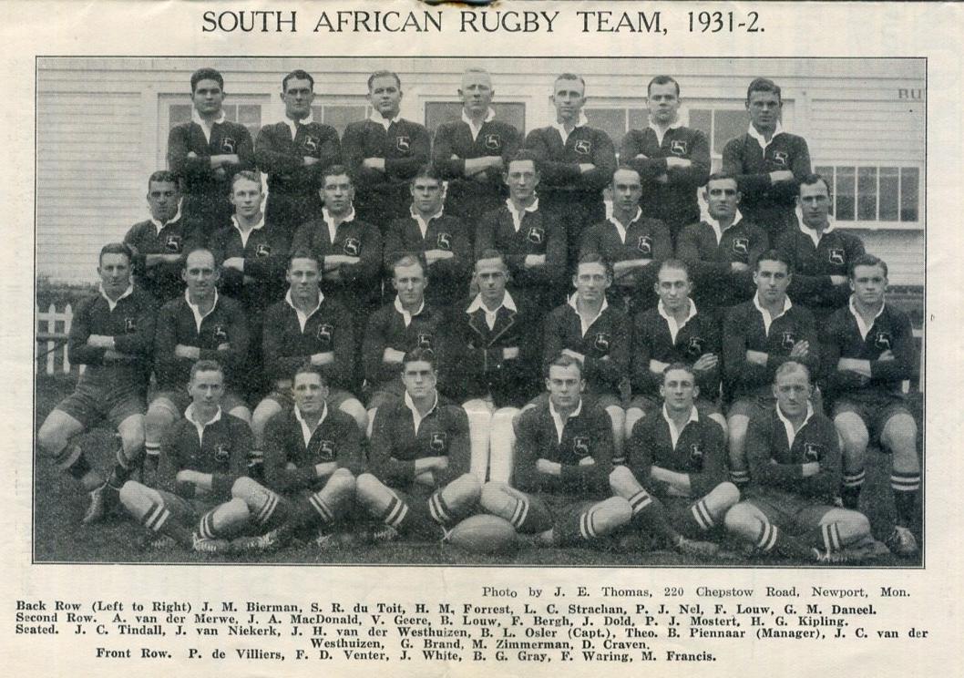 "SOUTH AFRICANS.- G. Brand (Western Province), back; J. K. van der Westhuizen (Western Province), J. C. van der Westhuizen (Western Province), F. W. Waring (Western Province), and M. Zimmerman (Western Province, three-quarter backs; B. L. Osler (captain), (Western Province), and P. de Villiers (Western Province), half-backs; J. N. Bierman (Transvaal), G. M. Dancel (Western Province), P. J. Nel (Natal), A. van der Merwe (Western Province), M. M. Louw (Western Province), P. J. Mostert (Western Province), and S. C. Louw (Western Province), forwards."