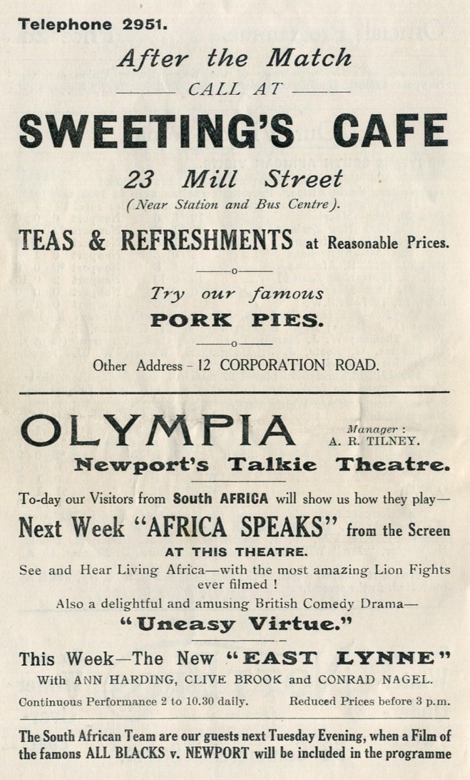 "Newport will be met this afternoon and Swansea on Saturday and, although there is not a great amount of optimism in the former town, the young side with apparently a strong pack of forwards at Swansea are not without hopes of sustaining the Welsh reputation for giving teams from the Dominions the fights of their lives. Needless to say, both the South Africans and their opponents measure their chances according to the state of the weather, the wet, as ever – though not as inflexibly as most people would contend – being taken to favour the Welshmen."