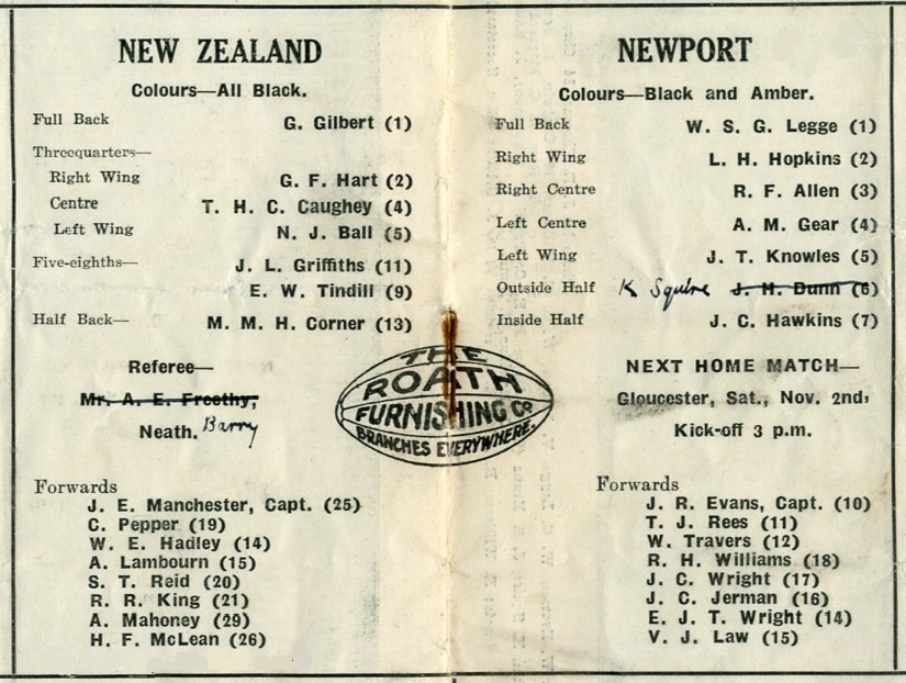 When the New Zealanders arrived in Newport they were in a confident mood after two impressive victories - against Cardiff and Llanelli. The Newport team was without the regular outside half, Joe Dunn, and Ken Squire substituted. Heavy rain fell during the morning but the crowd had reached around 20,000 at the kick-off. The All Blacks attacked strongly from the start and within eight minutes Eric Tindall, at five-eighth, had dropped a neat goal. There followed a long period of pressure from the Newport forwards urged on by scrum-half Jim Hawkins, who made several storming runs which just failed to bring a score. Just before the interval however a harsh decision gave the All Blacks a penalty and Gilbert's kick just scraped over the bar. At half-time the All Blacks led by 7pts to nil (a drop goal was then 4pts) and three minutes after the change-over the Usksiders were 11 pts in arrears when Tindall dropped his second goal.