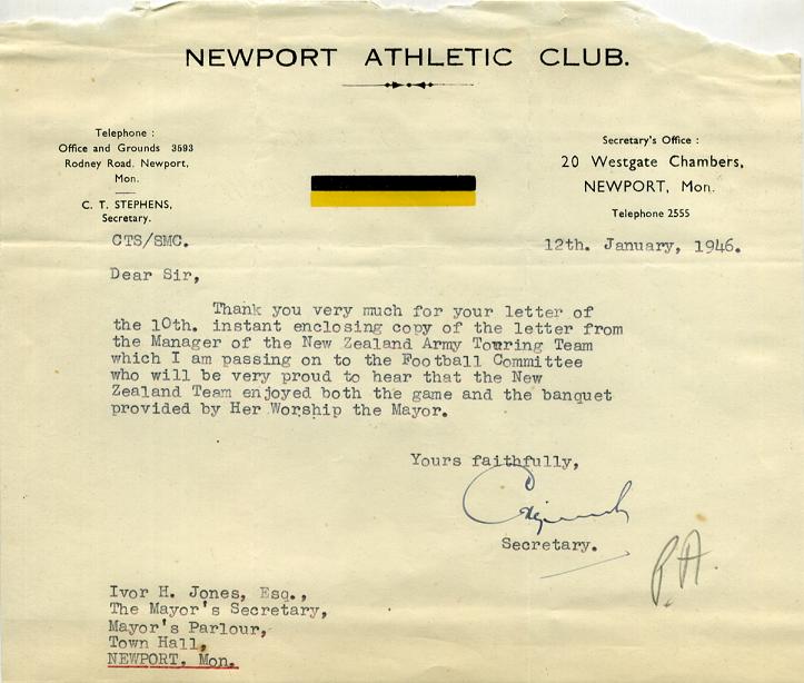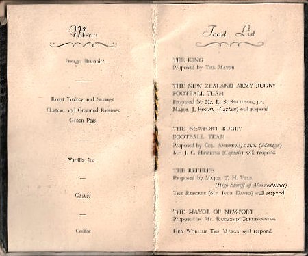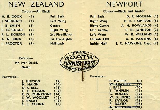 Anecdote: The actual match programme used for some of the illustrations shown above included the following eye witness summary of the game as hand written notes, the author is not known at present: "Saw this game with Capt. Thomas (Dockmaster) Newport and Arthur Harris. A very hard game which Newport should have and deserved to win. Bale the hooker sustained broken rib after quarter hour and Newport were a man short for the rest of the game. Big crowd - ground full. Cook a grand full back but the New Zealand backs were not sure of themselves and did not have a centre capable of breaking through. Jim Hawkins played a masterly game and was outstanding . The Newport threes were not fast enough to score, even though they broke through often. They lacked the speed but not the will. All Newport forwards were grand. Morgan was as good as Cook."