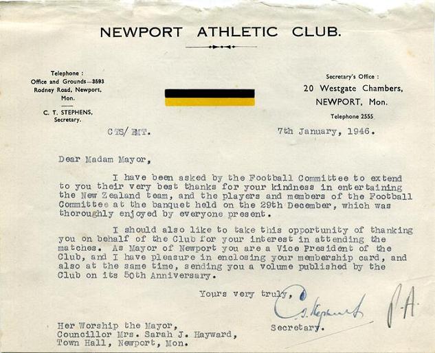 "In the name of Rugby football and the Newport Athletic Club we welcome the New Zealanders to Rodney Parade to-day, sincerely greeting them as valiant comrades, great Rugby players, true sportsmen and gentlemen on and off the field."
