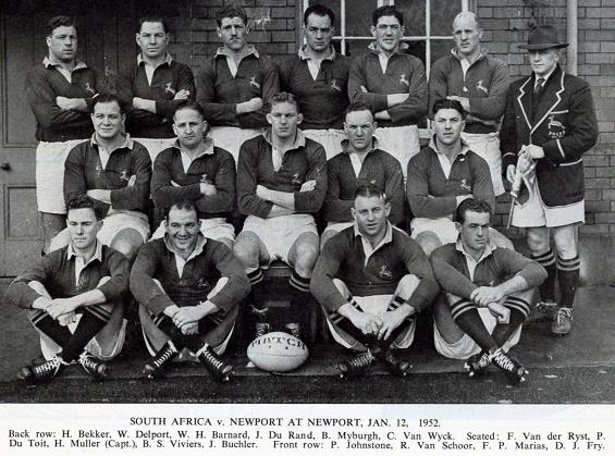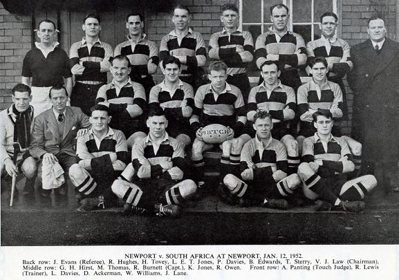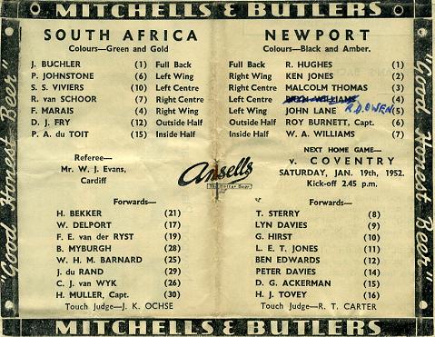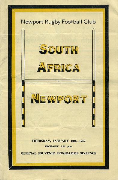 Following on from Newport's fantastic season of 1950-51, a lot was expected from R.T.(Bob)Evans and his team against the graceful Springboks. Unfortunately Newport were not able to match their visitors and although they battled hard up front, they could not contain the free running and sweeping back play of the Southern hemisphere opponents. An early try by right wing Marias eight minutes from the start settled the Springboks and encouraged them to open up. Newport found it difficult to cope with the South African's backing up.
