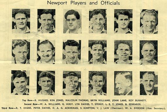 "NEWPORT.- R. Hughes; K. Jones, M. C. Thomas, R. D. Owen, J. Lane; R. Burnett (capt.), W. A. Williams; G. Hirst, Lyn Davies, T. Sterry, L. E. T. Jones, B. Edwards, H. J. Tovety, P. Davies, D. G. Ackerman."