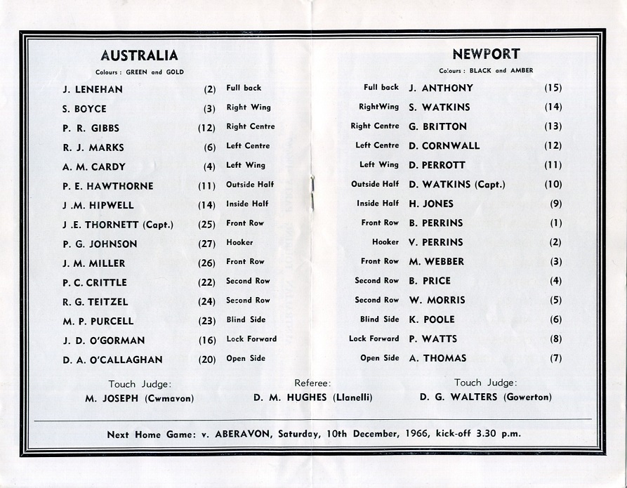 "It gives me the greatest pleasure on the occasion of the Newport fixture against the touring Australian side to renew acquaintances, if only by way of this programme, with our thousands of Welsh friends who did much for making our 1963/4 tour the pleasant memory it will always remain. I have spoken many times to Frank Kilby, Neal McPhail and the other members of our Touring party who without exception regard the four months we spent in the U.K. as the greatest days in our rugby lives and very prominent in our thoughts are our memories of Wales."