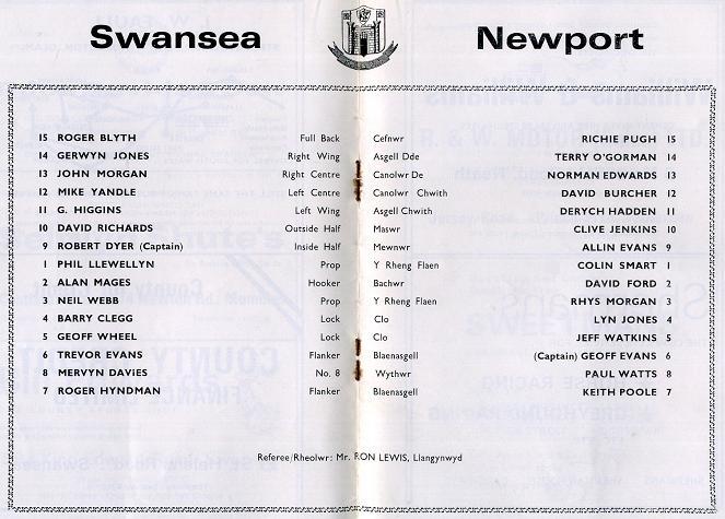 "Swansea were well represented at the first Welsh Trial by Phil Llewellyn, Geoff Wheel and Mervyn Davies in the Probables, and Roger Blyth and Barry Clegg in the Possibles with Roger having the personal satisfaction of scoring eleven of his sides twenty two points."