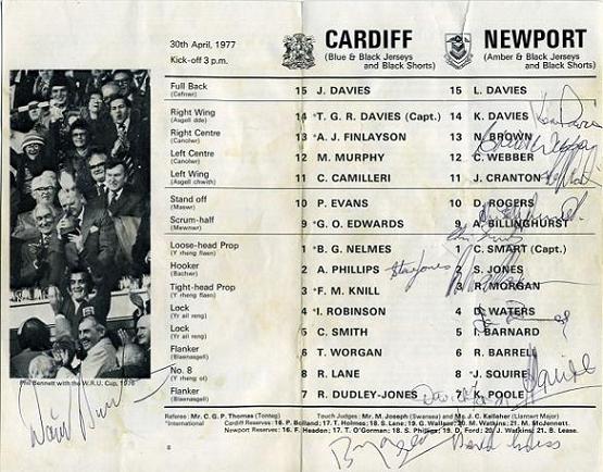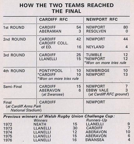 "An air of unreality will envelop the National Stadium this afternoon where Cardiff and Newport meet in the sixth WRU challenge cup final. Unreal because for the first time since the competition began in 1971-72, Llanelli have failed to make the final. Indeed so strong has been their hold that until they were put out by Cardiff in the third round of this years' competition, Llanelli had lost only one cup match in five years and that the final against Neath in the first year!"