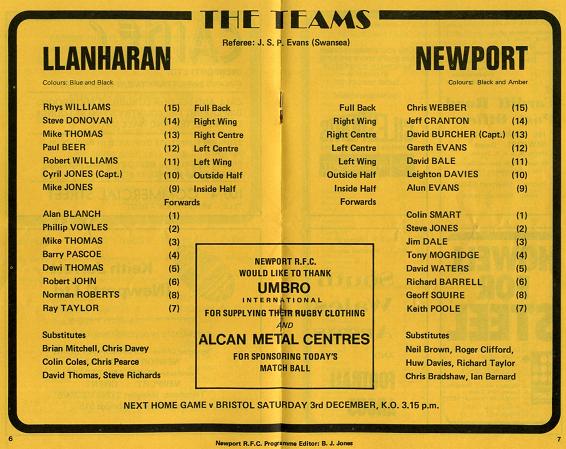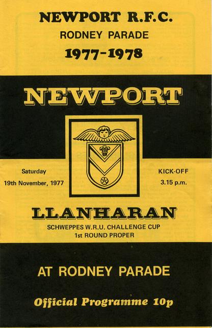 "This afternoon we are delighted to welcome Llanharan to Rodney Parade, as we commence our defence of the W.R.U. Challenge Cup. For many years relationships between our two clubs have been of the highest order and the United are always aware of the opposition they can expect from those "other Blue & Blacks" from across the border."