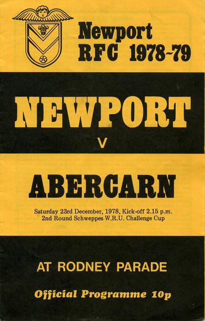 "This afternoon Newport R.F.C. are delighted to extend a very warm Rodney Parade welcome to their near neighbours from the Western Valley, Abercarn. Although this is not the first meeting between the two clubs, there have been four previous meetings with the Black and Ambers winning them all, it is the most important during the modern era. During recent years Abercarn have been one of the most consistant and outstanding clubs in the Monmouthshire Union."