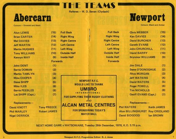 "The Green and Blacks achieved this afternoons game by defeating Llandybie 22-6 in the previous round and it is certain that they will be trying to lower our colours with a brand of attacking rugby that coach Lewis Collins has insisted upon. Full back Martin Hughes an ex-Newport Youth player is an enterprising full back while wings Brian Carter and John Budgett certainly know the way to the try line. Centre Jeff Martin, will be remembered by Rodney Parade regulars for his fine attacking play in a Black and Amber jersey a few seasons ago. His co-centre Mel Davies is the teams leading points scorer this season with over 100 points. At half back, Abercarn have former Welsh Youth International Tony Williams, who played at outside half for Cross Keys for two seasons, and Kevin Way, who took over from K. Kinsey who had a short stay at Cardiff. Up front Martyn Tamlyn, John Dent, Les Ship and Barry Beebles are four forwards who provide 'good ball'."