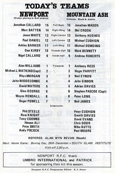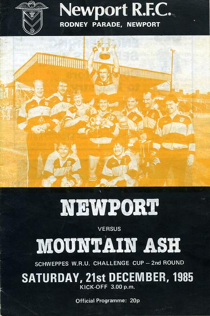 "Cup rugby returns to Rodney Parade this afternoon with the visit of Mountain Ash in the 2nd round of this season's Schweppes W.R.U. Challenge Cup competition. A great deal of water has passed under Newport Bridge, and even George Street Bridge has been built since the "Old Firm" last visited Rodney Parade. The other "Black and Ambers" lost here on 31st March 1902, when Newport, led by G.LI. Loyd, won by 22pts to 3pts."