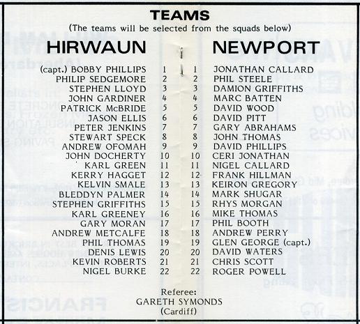 This game proved to be a mis-match as Newport ran out eight tries to one winners at the Welfare Ground. David Pitt dashed over for a hat-trick, Nigel Callard bagged a brace and Damien Griffiths, Jon Callard and Marc Batten completed the job. After holding Newport to a single Nigel Callard try after half an hour, Hirwaun eventually buckled under the strain and were swept aside as gradually the Newport pack squeezed the last drop of energy out of the home eight. Referee Gareth Simmonds chose to ignore a series of blatant Hirwaun infringements. He had turned up late for the kick-off and did not get any better!
