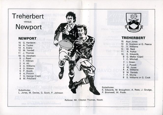 "Today's Treherbert side does not contain any Welsh Internationals, but our visitors from Newport, can be assured of a typical Rhondda welcome, both on the field and back in our Clubhouse at the end of the game. Let us hope today's match will be worthy of the name of Welsh Rugby."