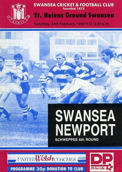 "Today however we concern ourselves not with league or international football but with the Schweppes Cup Competition and we welcome our visitors Newport. The black and ambers perhaps surprised most when they defeated Pontypridd 12-3 in the twice postponed tie in the fifth round. After an indifferent start to the season Newport have shown an improvement of late and although the Whites have recorded the double over their opponents this season by 29-19 and 31-21 today's result is no foregone conclusion. Newport have played 31 games, won 12, lost 18, and drawn 1 with 498 points for and 696 against. Since the resignation of coaches Jim McGreedy and Keith Jones in November and the appointment of new coaches Gareth Evans and Nev Johnson together with manager Stuart Watkins there has been a greater commitment in the team despite injuries to lock Andrew Perry, hooker Keiron Gregory, flanker Andy Pocock and the enforced retirement of prop Rhys Morgan after 537 games for the club. The team was also affected by the departure of David Phillips and Ceri Jonathan to Pontypool, Damion Griffiths to Cardiff and Jonathan Callard to Bath. However one of Morgan's fellow long service team mates continues to give valiant service to the club particularly in the line out. We refer of course to David Waters, with 547 games to his credit (Could Wales still use him?). The club's record scorer Paul Turner with 368 points in season 1986/7 has also returned to Newport from Newbridge."