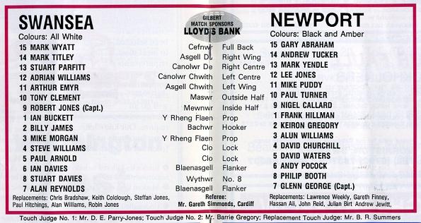 "Swansea: M. Wyatt, M. Titley, S. Parfitt, Adrian Williams, A. Emyr, A. Clement, R. Jones (capt), I. Buckett, W. James, M. Morgan, S. Williams, P. Arnold, I. Davies, A. Reynolds, S. Davies."