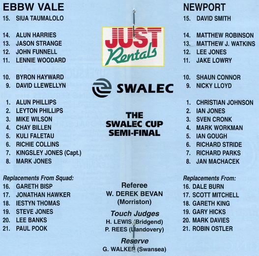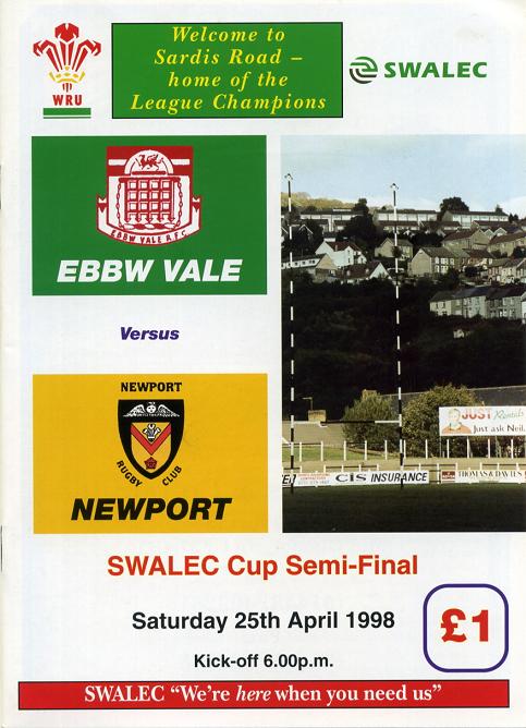 "This evening it is our very great pleasure to extend the warmest of welcomes to the players, officials and supporters of Newport and Ebbw Vale Rugby Football Clubs, deserved semi-finalists in the 1997-1998 SWALEC Cup Tournament. We wish the both teams the very best of luck, and in advance, offer our sincere congratulations to the victors and commiserations to the vanquished. While knowing, from our experiences in the Cup, the contrasts of emotions which will flood the ground at the final whistle, Pontypridd R.F.C trust that our organisation on the day will have played a part in making it a truly memorable rugby occasion."