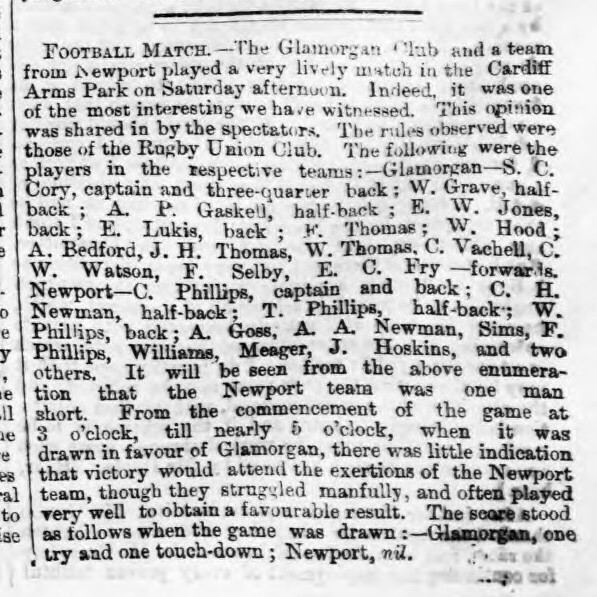 "FOOTBALL MATCH.- The Glamorgan Club and a team from Newport played a very lively match in the Cardiff Arms Park on Saturday afternoon. Indeed, it was one of the most interesting we have witnessed. This opinion was shared in by the spectators. The rules observed were those of the Rugby Union Club. The following were the players in the respective teams:- Glamorgan - S. C. Cory, captain and three-quarter back; W. Grave, half-back; A. P. Gaskell, half-back; E. W. Jones, back; E. Lukis, back; F. Thomas; W. Hood; A. Bedford, J. H. Thomas, W. Thomas, C. Vachell, C. W. Watson, F. Selby, E.C. Fry - forwards. Newport - C. Phillips, captain and back; C. H. Newman, half-back; T. Phillips, half-back; W. Phillips, back; A. Goss, A. A. Newman, Sims, F. Phillips, Williams, Meager, J. Hoskins, and two others. It will be seen from the above enumeration that the Newport team was one man short. From the commencement of the game at 3 o'clock, till nearly 5 o'clock, when it was drawn in favour of Glamorgan, there was little indication that victory would attend the exertions of the Newport team, though they struggled manfully, and often played very well to obtain a favourable result. The score stood as follows when the game was drawn:- Glamorgan, one try and one touch-down; Newport, nil."