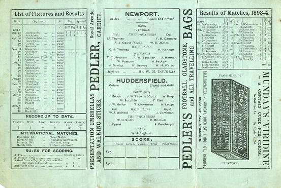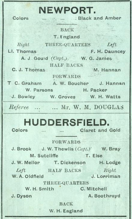 "Played at Newport in dull weather, before about 5,000 people. The ground was in excellent condition, and the utmost interest was manifested in the game. A few alterationsv were made in the visiting team as follows:- T. E. Dickinson in the place of Else, and J. Thornton in the place of Dyson. Newport had no alterations. Referee: Mr. W. M. Douglas, Cardiff. The following were the teams:- Newport: Back, T. England; three-quarter backs, F. H. Dauncey, W. G. James, A. J. Gould (captain), and W. Ll. Thomas; half backs, M. Hannan, and C. J. Thomas; forwards, A. W. Boucher, T. C. Graham, J. Hannan, W. H. Watts, H. Packer, J. Bowley, W. Groves, and W. Parsons. Huddersfield: Back, W. H. Eagland (Yorks County); three-quarter backs, J. Thornton (International and Yorks County), W. H. Smith, C. Mitchell, and A. Boothroyd; half backs, J. Lorriman and W. A. Oldfield; forwards, J. Brook, W. Bray, H. Lodge (Yorks County), J. W. Mellor, T. Dickenson (Yorks County), M. Sutcliffe, and J. W. Thewlis."