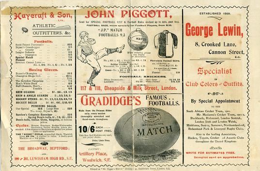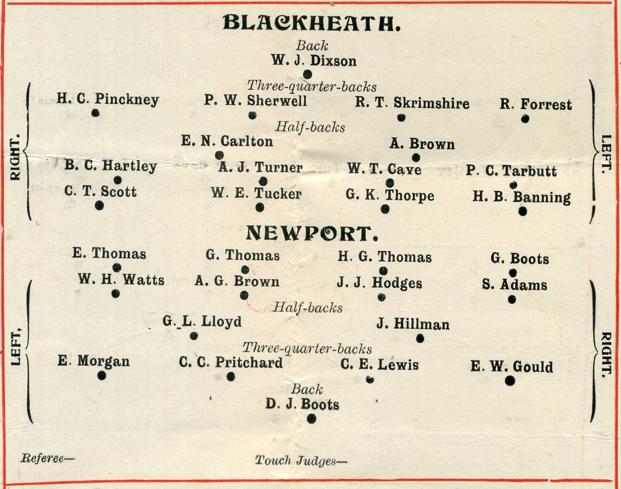 "The annual visit of the Newport fifteen to the Rectory Field, Blackheath, proved, as usual, a decided attraction, probably close on 10,000 spectators being present. As could only be expected on the season's form, the Newport men had no great difficulty in winning by a handsome margin. As a matter of fact they won by four goals (one dropped) and a try to a dropped goal. It was a curious match. Quite early Blackheath lost Tarbutt, one of their forwards, but that incident had little influence on the game. Blackheath always held their own forward, and their backs tackled admirably. In defence Blackheath were excellent, but they did not display any ability as an attacking force. Their halves were painfully weak, and as a consequence a very fair three-quarter line had no chance. On the other hand, the Newport backs showed great resource and combination. Llewellyn Lloyd, the international, was in great form at half-back, and he not only had a hand in every try, but dropped a neat goal. Time after time he opened the game for his three-quarters, and though some of the Newport passing was wild, much was excellent. The game generally went in the direction of the right wing, and E. Morgan, well looked after by his centre, C. E. Lewis, had no difficulty in scoring three tries. G. C. Pritchard, the left centre, gained the other try, so that all the scoring for Newport was accomplished by the back division. To the captain, R. T. Skrimshire, fell the distinction of dropping the goal for Blackheath, and a beautiful effort it was."
