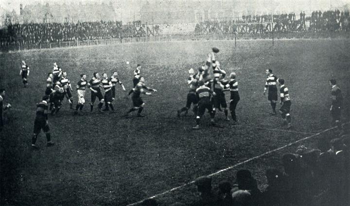 Among those in the picture above are (left to right)]. L. Forbes (at inside centre) and at the back of the lineout J. G. Cunningham, L. M. Speirs, J. D. Bowie, A. G. Cairns and J. C. McCallum. A. F. Wilson, J. T. Simson and J. M. Phillips are at the front.