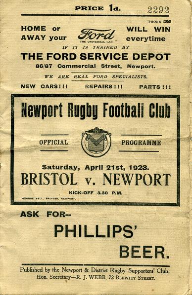 "The first game was away in 1920-21, and Newport, having lost their record at Gloucester, met Bristol the following week-end - February 5th - and were fairly and squarely beaten on the general run of the play, Jack Rees and Reg. Plummer got unconverted tries for Newport, but Bristol scored two tries which were converted, and also got a penalty goal, so that the visitors retired beaten by 13 points to six."