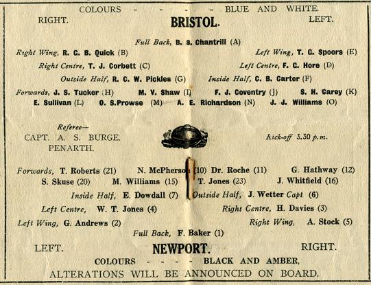 "Strange to say Newport won very decisively away on October 15th, last season. Jack Wetter was in brilliant form that day. He kicked a fine penalty goal, and also converted two of the three tries registered by Jack Rees, Tom Jones and W. Jones, and with Bristol failing to reply, Newport ran out victorious by 16 points to nil."