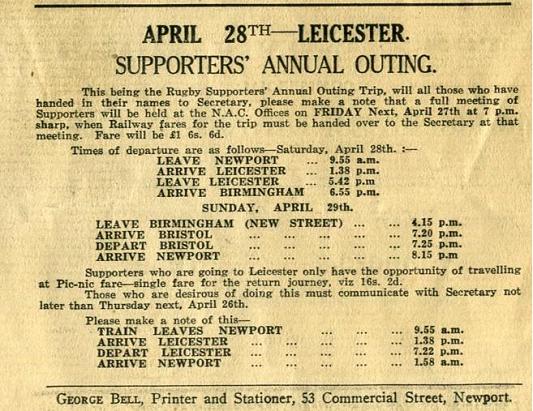 "Shuld Newport, as we loudly hope, clear this obstacle, then all roads should lead to Leicester for the last match of the season on Saturday next, Newport will want all the helpful encouragement they can get in the way of supporters to cheer them on to victory, and should jack Wetter have the very rare honour of captaining an invincible side, then we would remind Rugby followers that they will have another opportunity of seeing Cardiff and Newport in opposition, at the Cardiff Arms Park, on Monday, April 30th - kick-off 6 p.m."