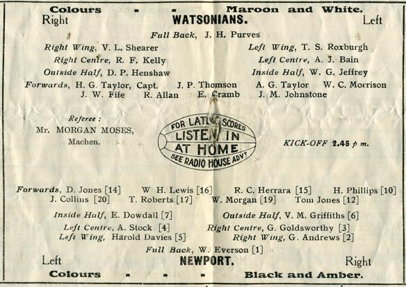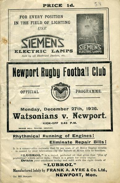 "To Newport Rugby enthusiasts, the visit of the Watsonians is as essential a feature of the Christmas round of enjoyment as the plum pudding, and to-day we extend heartiest welcome to the famous Scottish Club on their twenty-seventh visit to Rodney Parade."