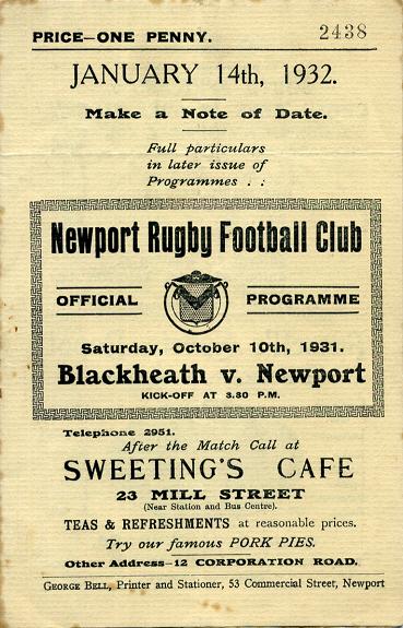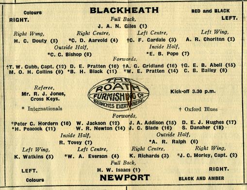 "The South African match over, we return to ordinary Club football, and to-day welcome Blackheath, old and honoured rivals, than whom no Club is worth a better reception at Newport, It is an old story how in the early days of Welsh Rugby invincible Newport ruled the roost, and at last challenged England's Champions. Blackheath accepted, came to Newport in 1879, and piled on 4 goals, 9 tries without a response from Newport. Those days of inferiority passed quickly, and through the years Newport have built up an amazing record against a Club which represents the best Rugby in England."