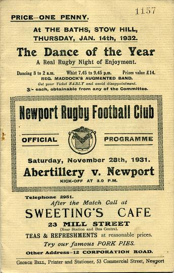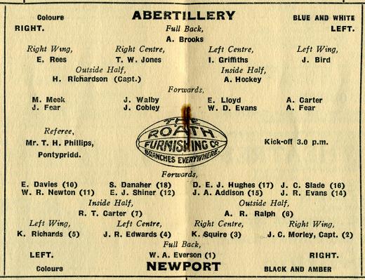 "Abertillery have done very well against Newport in recent seasons, and of the last eleven games they have lost only four games, won five, and drawn two. They have not fared very well at Newport, however, though in 1928 they won on the Athletic Ground by 1 goal, 1 try, to 2 tries. Newport have not won at Abertillery since 1924."