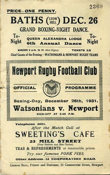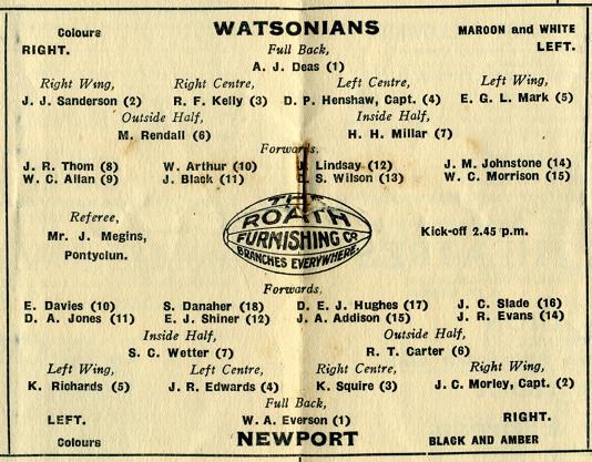 "To us in Newport, Christmas without the Watsonians would be like beef without mustard, for there are no more welcome visitors to the Athletic Ground than these famous Scots. Indeed, one of the biggest gates Newport have ever had for a purely Club game was that in 1928, when over 10,000 paid £420 to see Newport beat the Watsonians by 3 goals, 15 pts. to 2 goals (1 p.g.), 8 pts."