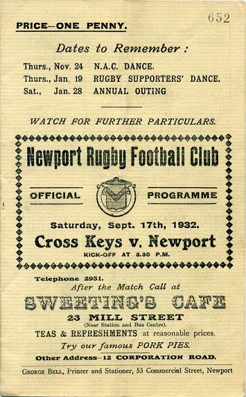 "It is, of course, a well-known fact that Cross Keys have never won on Newport Athletic Ground - a remarkable thing when we remember some of the grout teams Cross Keys have had since the war."