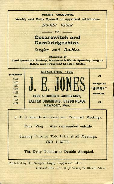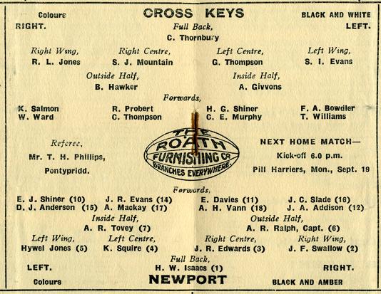 "Last season Newport won both games, though in both they had nothing to spare. In September the margin at Newport was 2 goals (1 p.g.), 8 pts. to 1 p.g., 3 pts., and in January at Cross Keys, 2 tries, 6 pts. to 1 p.g., 3 pts."