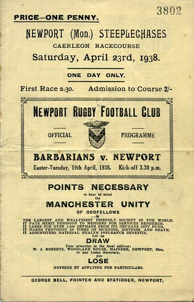 "In the last two seasons, Welsh clubs have, to a certain extent, re-established their old ascendancy over the famous tourists, for in 1936 they lost to Cardiff and only drew at Newport (11-11) after beating Penarth and Swansea. Last season the Barbarians beat Penarth and Swansea, but lost at Cardiff 16-3, and at Newport 7-3."
