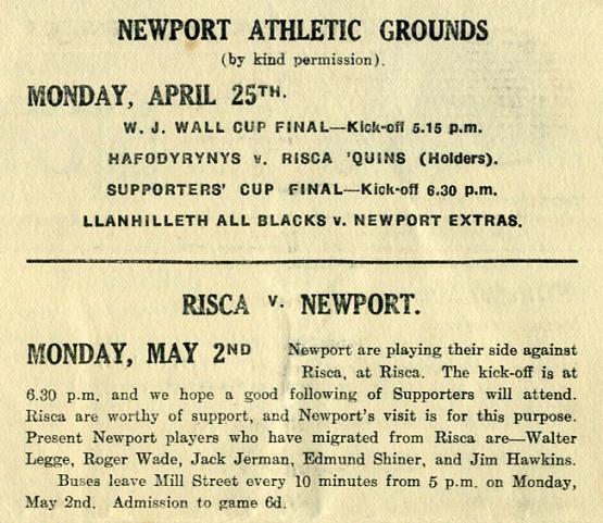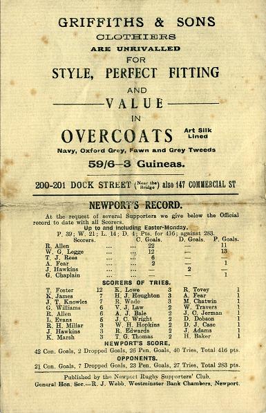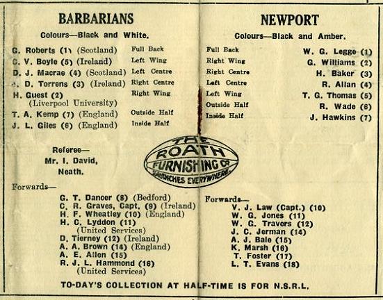 "In the previous five seasons, the Barbarians won all their games in Wales outright - a wonderful achievement - and in that period they beat Newport successively 18-9, 9-6, 21-9, 11-6, and 23-3. In all the Barbarians have played at Newport 36 times. Newport can point to 27 victories to the Barbarians eight."
