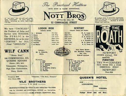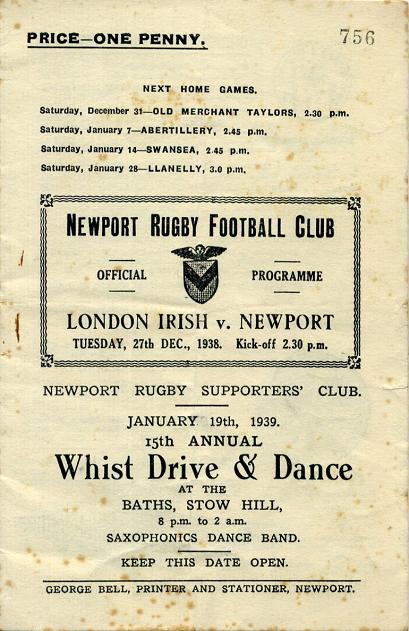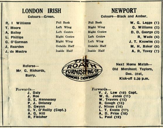 "In an effort to provide brighter and more appropriate fare in the Christmas programme, Newport re-arranged their fixtures this season, and instead of Bridgend or Aberavon providing the opposition to-day, as would have been the case had custom been followed, a new team will be seen on the Athletic Ground this afternoon. For Newport have never played London Irish before."