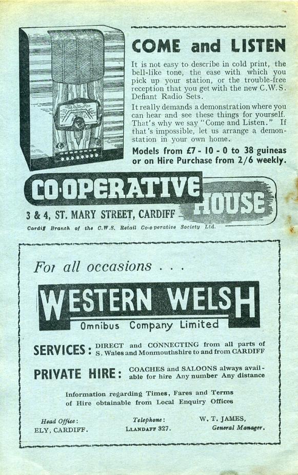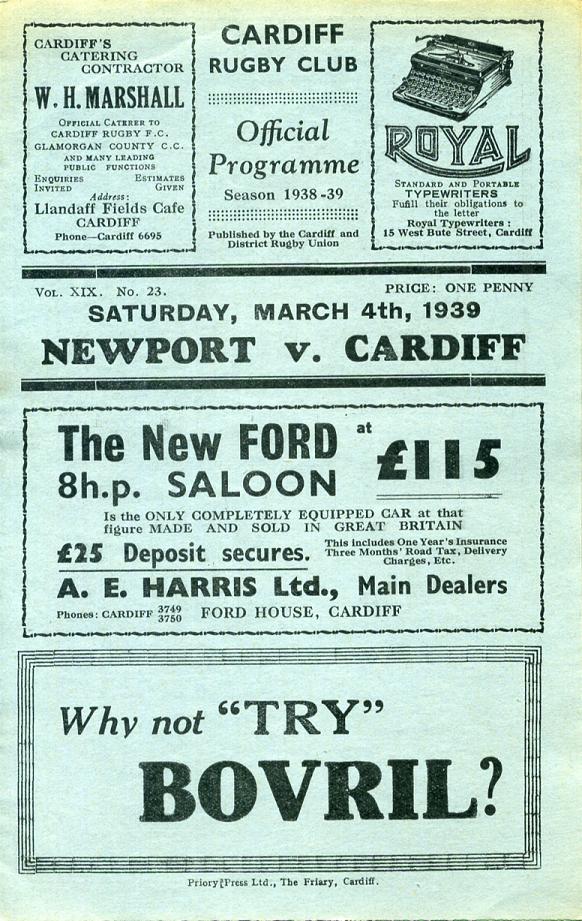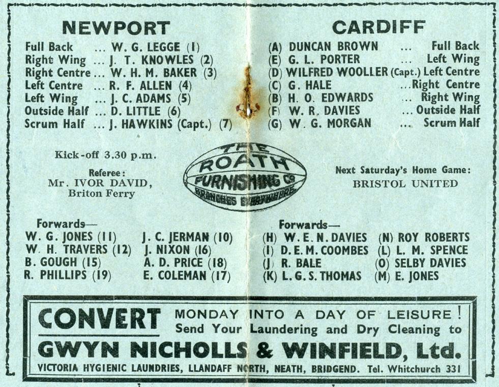 "To-day's clash with Newport is probably the most important of the season as it gives the Blue and Blacks an opportunity of securing their fourth win in one season over their famous rivals. This has only happened twice in the meeting of the two sides, i.e., in seasons 1897-8 and 1905-6, when Cardiff did the trick on each occasion, and there will doubtless be tremendous excitement over the issue this afternoon. "The gentleman's agreement regarding scrummaging will again operate and considerably more open back play should result. It is obvious that Newport are going to have a big say in the trend of affairs as they have chosen the very strongest available team and it is observed that in a strong back division, Little retains his place at outside half. Allen and Adams will prove Newport's strongest attacking link. In a pack which will be formidable whichever eight plays, the only doubt applies to V. J. Law, the Newport captain, who may stand down in view of his selection to represent Wales against Ireland next Saturday. If Travers gets an undue share of the ball, the Newport backs may well give Cardiff a very anxious time, although they will have to introduce more than ordinary ingenuity to circumvent the cleverness of the Cardiff backs. Indeed, Newport must consider Wooller their Football Enemy No. 1, as the Cardiff captain has developed a penchant for bringing off the unexpected against the Usksiders. Only a fortnight ago he dropped the goal and converted a penalty by which Cardiff won by 7 pts. at Newport. In the previous game at Cardiff he also scored a sensational try and in every game for seasons past by his all round play and scoring proclivities he has been the main obstacle to thwart Newport in their efforts to gain the victory over their rivals."