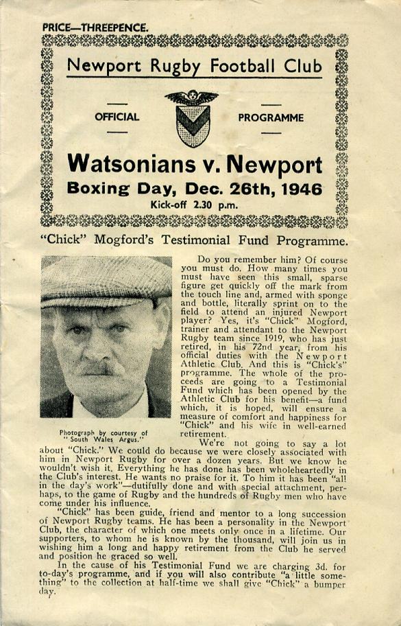 "Do you remember him? Of course you must do. How many times you must have seen this small, sparse figure get quickly off the mark from the touch line and, armed with sponge and bottle, literally sprint on to the field to attend an injured Newport player? Yes, it's "Chick" Mogford, trainer and attendant to the Newport Rugby team since 1919, who has just retired, in his 72nd year, from his official duties with the Newport Athletic Club. And this is "Chick's" programme. The whole of the proceeds are going to a Testimonial Fund which has been opened by the Athletic Club for his benefit - a fund which, it is hoped, will ensure a measure of comfort and happiness for "Chick" and his wife in well-earned retirement."