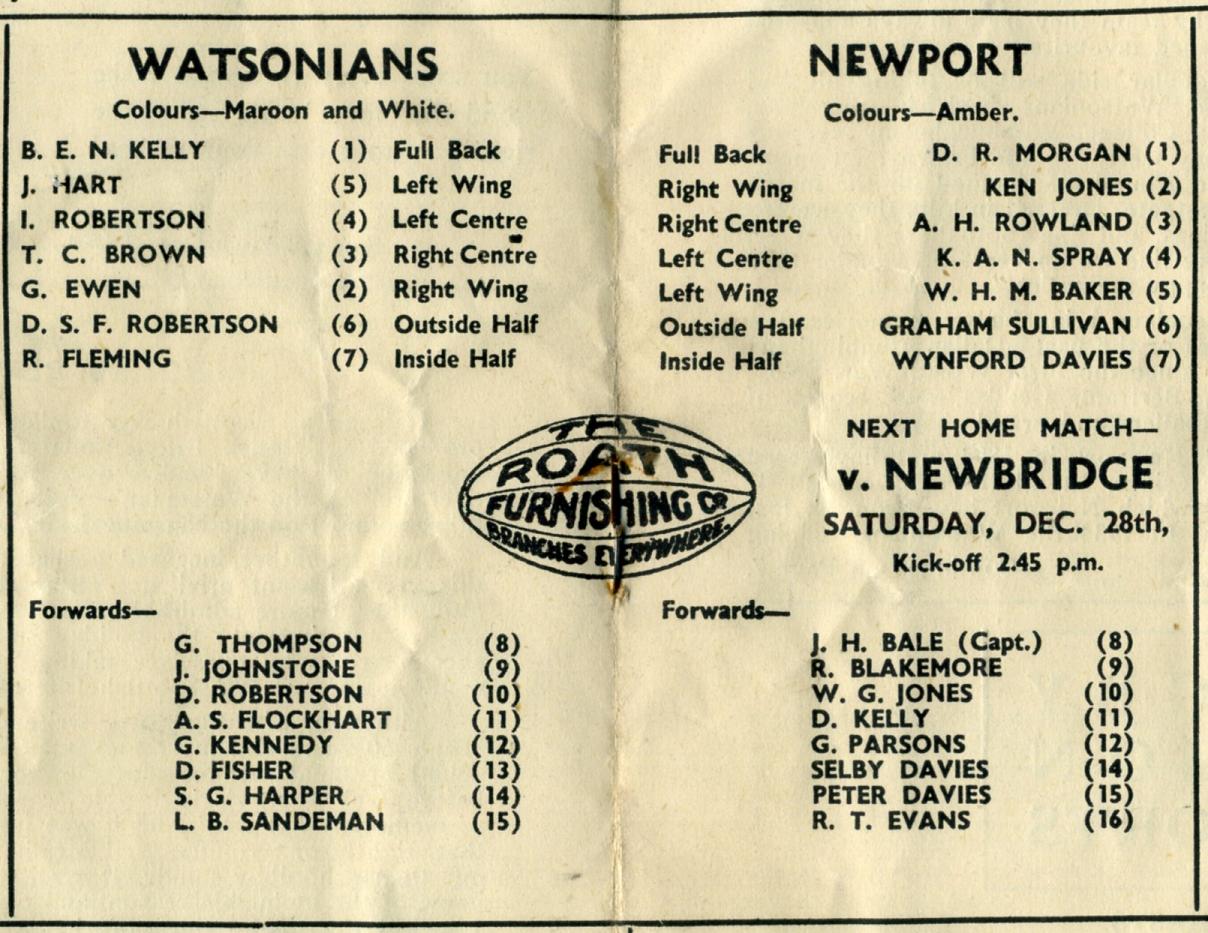 "It is an all Scottish day to-day, and as the Newport Club has produced a Scottish International forward - and an extremely good one too - we have handed over to Neil McPherson to "play the overture" to the Watsonian's visit which he does rather nicely, we think - almost on the bag-pipes! - in "A Peep in My Diary" on page 6." [ see http://www.historyofnewport.co.uk/players/players.php?id=000185 ]