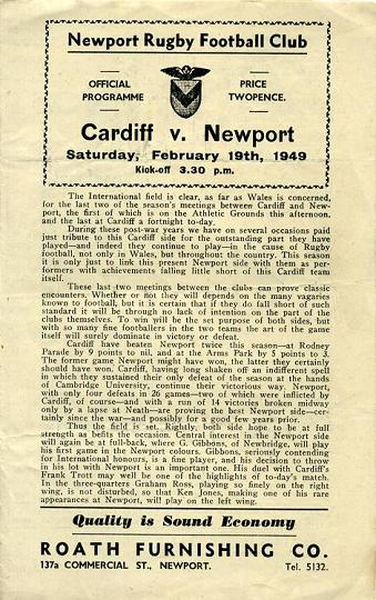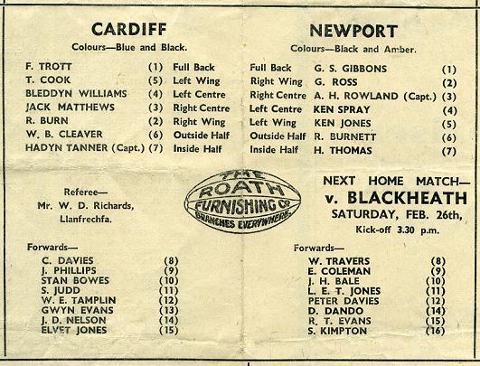"Cardiff have beaten Newport twice this season - at Rodney Parade by 9 points to nil, and at the Arms Park by 5 points to 3. The former game Newport might have won, the latter they certainly should have won. Cardiff, having long shaken off an indifferent spell in which they sustained their only defeat of the season at the hands of Cambridge University, continue their victorious way. Newport, with only four defeats in 26 games - two of which were inflicted by Cardiff, of course - and with a run of 14 victories broken midway only by a lapse at Neath - are proving the best Newport side - certainly since the war - and possibly for a good few years prior."