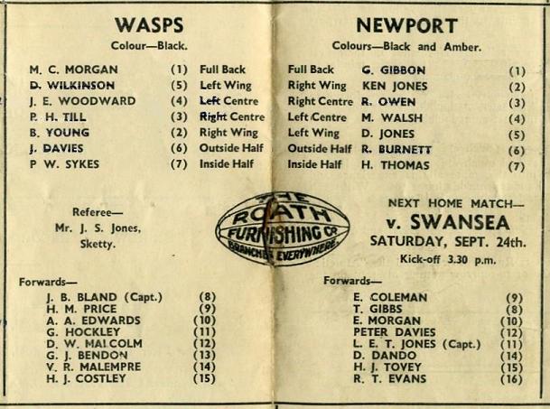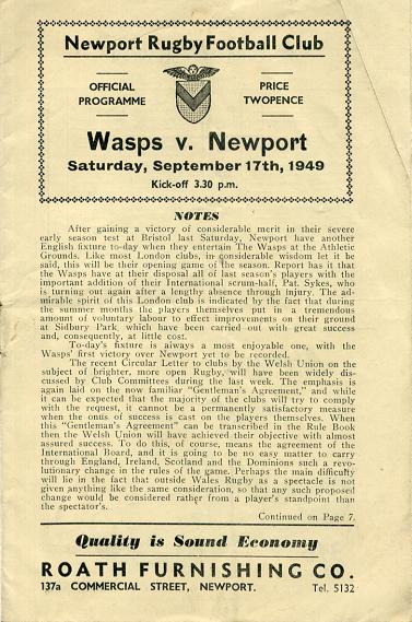 "After gaining a victory of considerable merit in their severe early season test at Bristol last Saturday, Newport have another English fixture to-day when they entertain The Wasps at the Athletic Grounds. Like most London clubs, in considerable wisdom let it be said, this will be their opening game of the season. Report has it that the Wasps have at their disposal all of last season's players with the important addition of their International scrum-half, Pat. Sykes, who is turning out again after a lengthy absence through injury. The admirable spirit of this London club is indicated by the fact that during the summer months the players themselves put in a tremendous amount of voluntary labour to effect improvements on their ground at Sidbury Park, which have been carried out with great success and, consequently, at little cost."