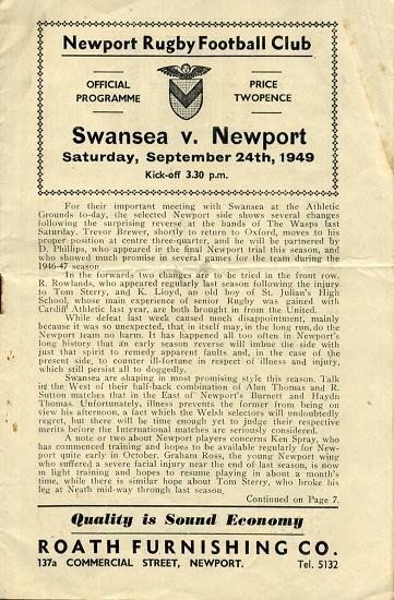 "For their important meeting with Swansea at the Athletic Grounds to-day, the selected Newport side shows several changes following the surprising reverse at the hands of The Wasps last Saturday. Trevor Brewer, shortly to return to Oxford, moves to his proper position at centre three-quarter, and he will be partnered by D. Phillips, who appeared in the final Newport trial this season, and who showed much promise in several games for the team during the 1946-47 season."