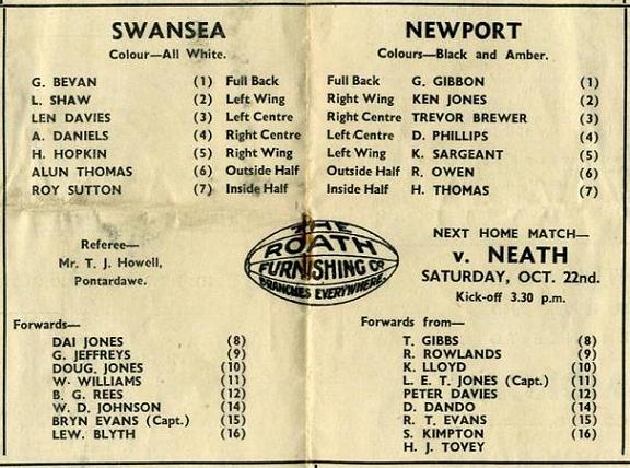 "Swansea are shaping in most promising style this season. Talk in the West of their half-back combination of Alun Thomas and R. Sutton matches that in the East of Newport's Burnett and Haydn Thomas. Unfortunately, illness prevents the former from being on view his afternoon, a fact which the Welsh selectors will undoubtedly regret, hut there will be time enough yet to judge their respective merits before the International matches are seriously considered."